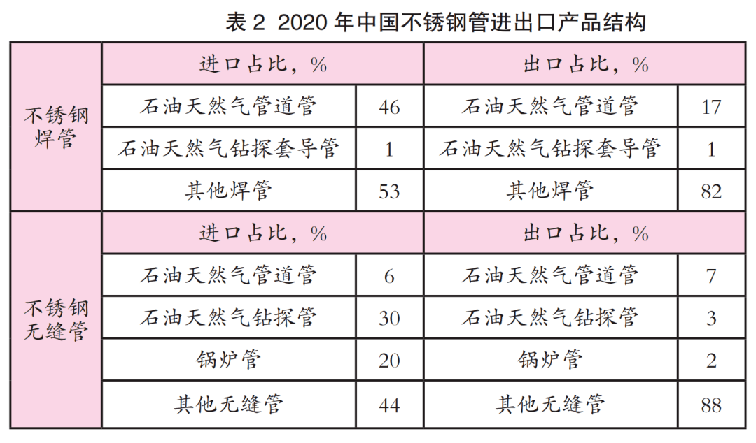 中國不銹鋼管進出口價格相差較大,說明目前國內(nèi)一些不銹鋼管下游領(lǐng)域使用的高端產(chǎn)品仍有部分需要進口,如不銹鋼油井管、高壓鍋爐管、核電蒸汽發(fā)生器用管等,而出口的不銹鋼管則以中低端產(chǎn)品為主。2020年中國不銹鋼管進出口產(chǎn)品結(jié)構(gòu)如表2所示。