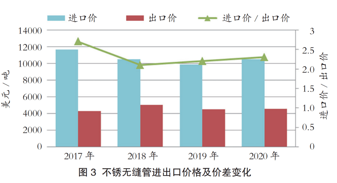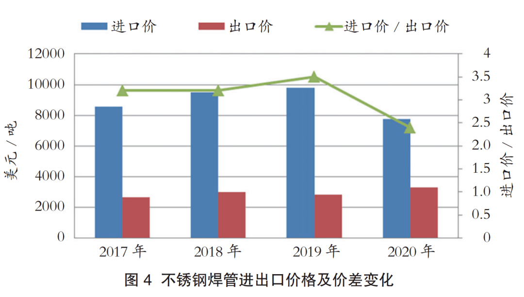 2020年不銹焊管進口平均價格為7732.02美元/噸;出口平均價格為3288.63美元/噸;進出口價差為4443.39美元/噸,進口價格是出口價格的2.4倍。2017-2020年中國不銹鋼焊管進出口價格及價差變化如圖4所示。