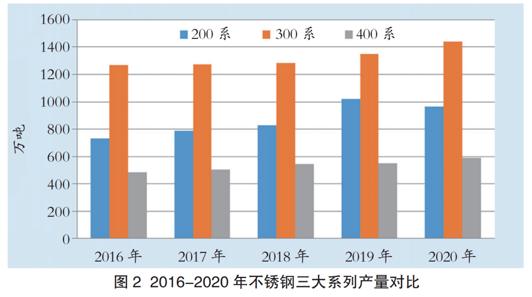 2020年中國不銹鋼表觀消費量為2560.79萬噸,同比增加155.46萬噸,增長6.46%。2016-2020年中國不銹鋼產(chǎn)量和表觀消費量走勢如圖1所示。2016-2020年三大系列不銹鋼產(chǎn)量對比如圖2所示。
