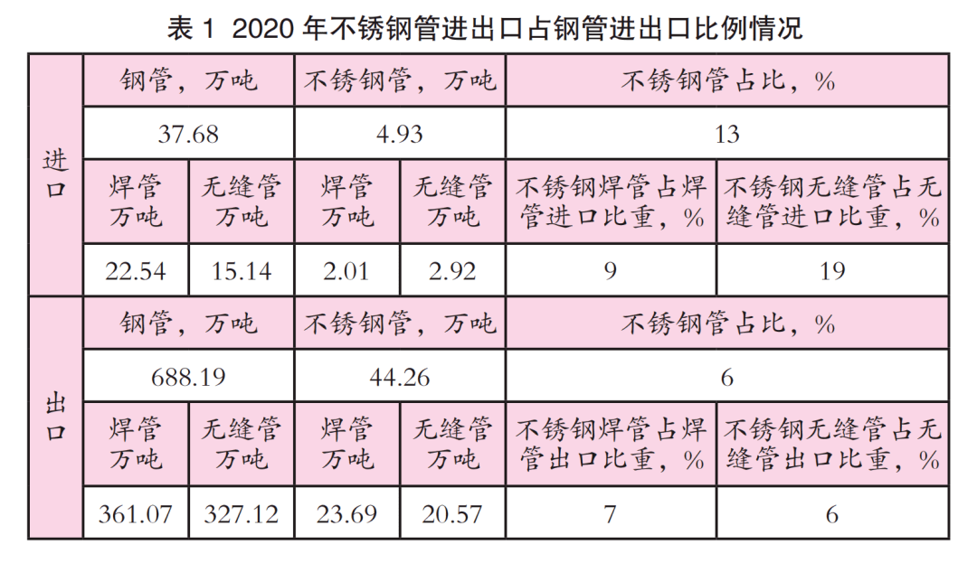 2020年中國不銹鋼管進口量為4.93萬噸,同比下降0.2 %;出口量為44.26萬噸,同比下降12.63%。其中,不銹無縫管進口量為2.92萬噸,同比下降12.84%,出口量為20.57萬噸,同比下降12.88%;不銹焊管進口量為2.01萬噸,同比增長26.42%,出口量為23.69萬噸,同比下降12.42%。2020年中國鋼管及不銹鋼管進出口情況如表1所示。