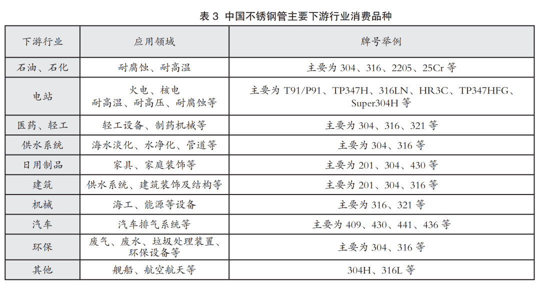 隨著中國石油化工、核電、海水淡化、污水處理、垃圾處理、海洋工程等領(lǐng)域的發(fā)展,對不銹鋼管質(zhì)量要求和數(shù)量需求會越來越高。中國不銹鋼管行業(yè)要瞄準(zhǔn)國際市場,進一步強化基礎(chǔ)研究,提高產(chǎn)品的穩(wěn)定性、耐久性,引領(lǐng)原創(chuàng)成果的突破,拓展為國家重大項目的服務(wù)領(lǐng)域,實現(xiàn)向技術(shù)創(chuàng)新、綠色化、智能化先進制造產(chǎn)業(yè)的轉(zhuǎn)型。中國不銹鋼管主要下游行業(yè)消費品種如表3所示。